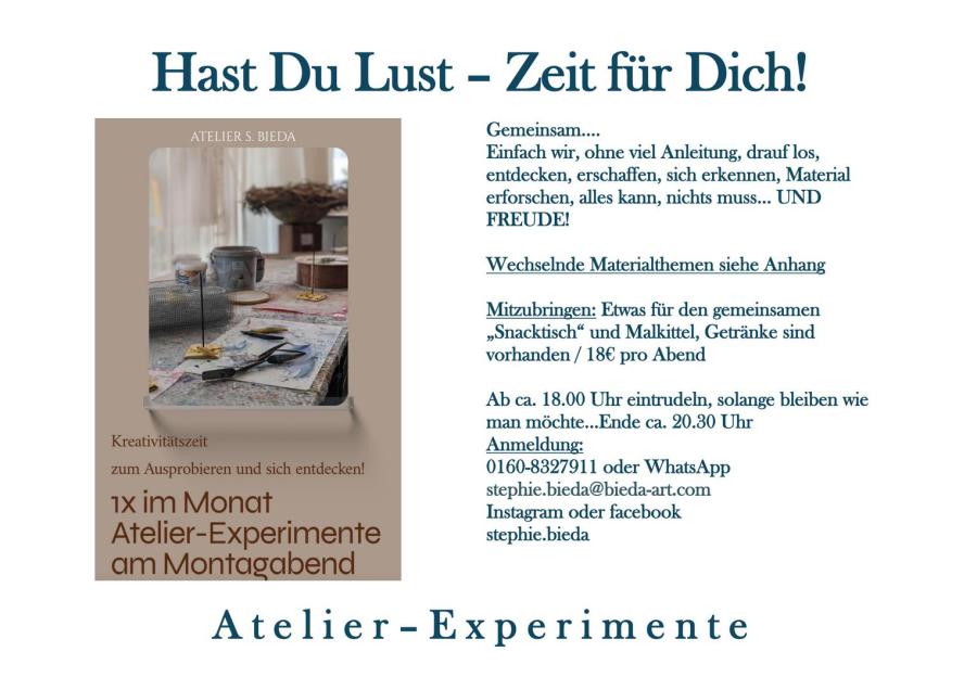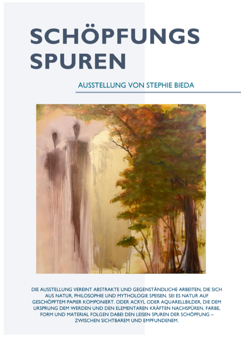 Die Ausstellung vereint abstrakte und gegenständliche Arbeiten, die sich aus Natur, Philosopie und Mythologie speisen, sei es Natur auf geschöpftem Papier komponiert, oder Acryl, die dem Ursprung dem Werden und den elementaren Kräften nachspüren, Farbe, Form und Material folgen dabei den leisen Spuren der Schöpfung - zwischen Sichtbarem und Empfundenem.